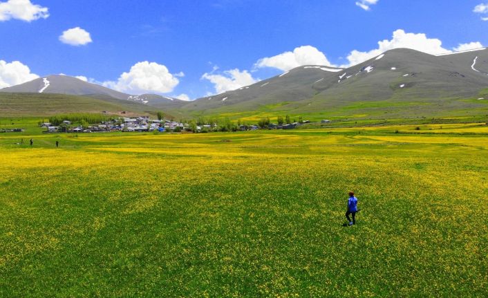 Erzurum’daki Konaklı Dağı ve Palandöken Dağları arasında kalan ve kent merkezine 25 kilometre uzaklıkta bulunan Yağmurcuk Mahallesinde baharın gelmesiyle filizlenen sarı renkli mayıs çiçekleri, ovaları sarıya boyadı.