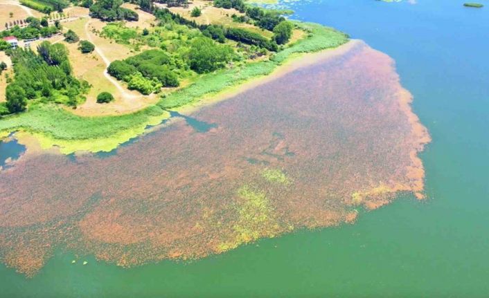 Durugöl olarak da bilinen Terkos Gölü’nün İstanbul’un Arnavutköy ilçesinde kalan kısmında, ilkbaharla birlikte yüzeye yayılan yeşil renkli bitkiler görsel şölen sundu. Bitkilerin renk değişimi, gölün yüzenin bazı kesimlerini pembeye dönüştürdü. Dronla görüntülenen göldeki güzel manzara dronla havadan görüntülendi.
