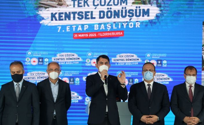 Çevre ve Şehircilik Bakanı Murat Kurum Bursa’da Mevlana Mahallesi’nde 7. etap kentsel dönüşüm yıkım töreninde konuştu. Kurum, 5 yılda 1 buçuk milyon konutun dönüşeceğini söyledi.
