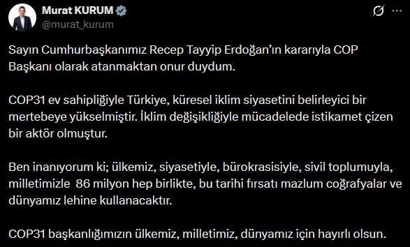 Cumhurbaşkanı Recep Tayyip Erdoğan’ın kararıyla COP Başkanı olarak atanan Çevre, Şehircilik ve İklim Değişikliği Bakanı Murat Kurum, sosyal medya hesabından yaptığı paylaşımda, şu ifadelere yer verdi; "Cumhurbaşkanımız Recep Tayyip Erdoğan’ın kararıyla COP Başkanı olarak atanmaktan onur duydum. COP31 ev sahipliğiyle Türkiye, küresel iklim siyasetini belirleyici bir mertebeye yükselmiştir. İklim değişikliğiyle mücadelede istikamet çizen bir aktör olmuştur. Ben inanıyorum ki; ülkemiz, siyasetiyle, bürokrasisiyle, sivil toplumuyla, milletimizle 86 milyon hep birlikte, bu tarihi fırsatı mazlum coğrafyalar ve dünyamız lehine kullanacaktır. COP31 başkanlığımızın ülkemiz, milletimiz, dünyamız için hayırlı olsun."
