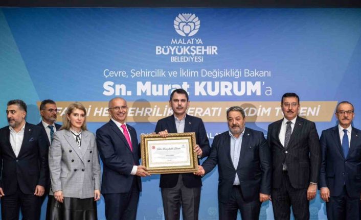 Çeşitli programlar ve deprem sonrası çalışmaları yerinde incelemek üzere Malatya’ya gelen Çevre Şehircilik ve İklim Değişikliği Bakanı Murat Kurum’a Büyükşehir Belediye Meclisi tarafından ‘Fahri Hemşehrilik Beratı’ verildi.
