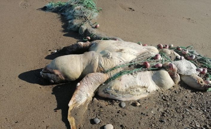 Antalya’nın Aksu ilçesinde balıkçı ağına takılarak ölen caretta caretta sahile vurdu.