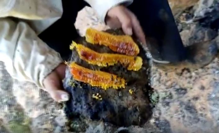 Mayıs sonu ve Haziran başı gibi oğul veren arıların gelip kaya boşluklarına girdiğini söyleyen Ali Asker Aykurt, "Ben de ağustos sonunda ve eylül ayında gelip bu balı alıyorum. Hiç insan eli değmiyor. Tamamen organik bal. Taş balını bu taşlardan çıkarıyorum" dedi.