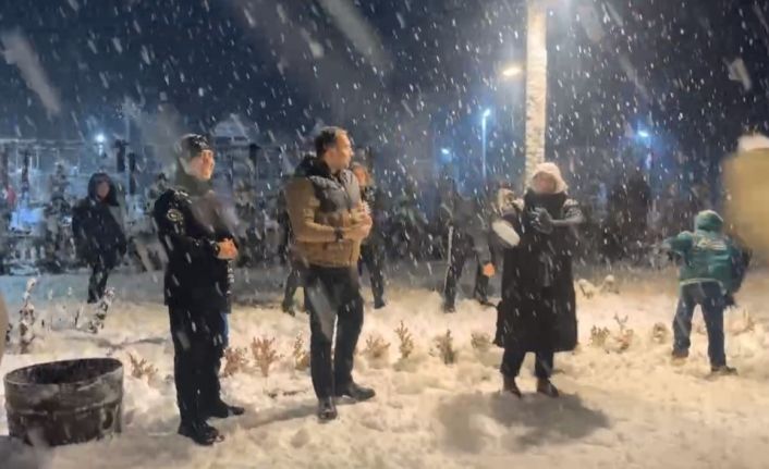 Bartın’ın Ulus ilçesinde etkili olan kar yağışı nedeniyle İlçe Kaymakamı Fırat Kadiroğlu, kurum müdürleri, hakimler ve savcıların da aralarında bulunduğu ilçe protokolü, meydanda vatandaşlarla buluşarak kar topu oynadı. Akşam geç saatlere kadar yoğun kar yağışının keyfini süren protokol ve vatandaşlar, ateşin etrafında ısınarak, halay da çekti.