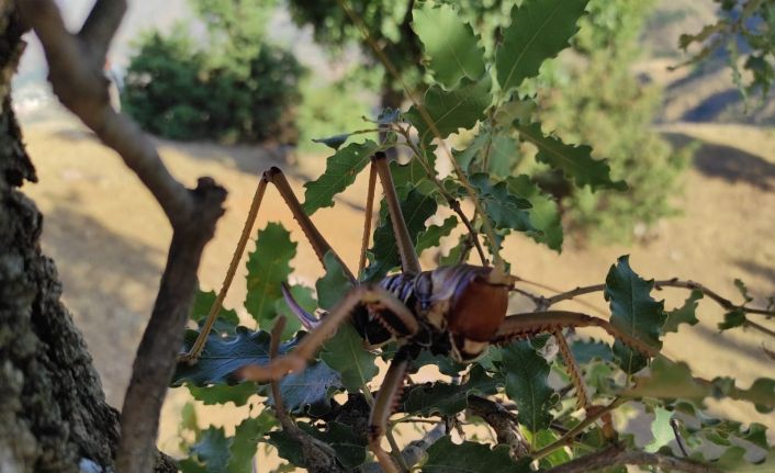 Batman’ın Sason ilçesinde yapraklar arasında bulunan dev etçil çekirge görenleri hayretler içinde bıraktı.