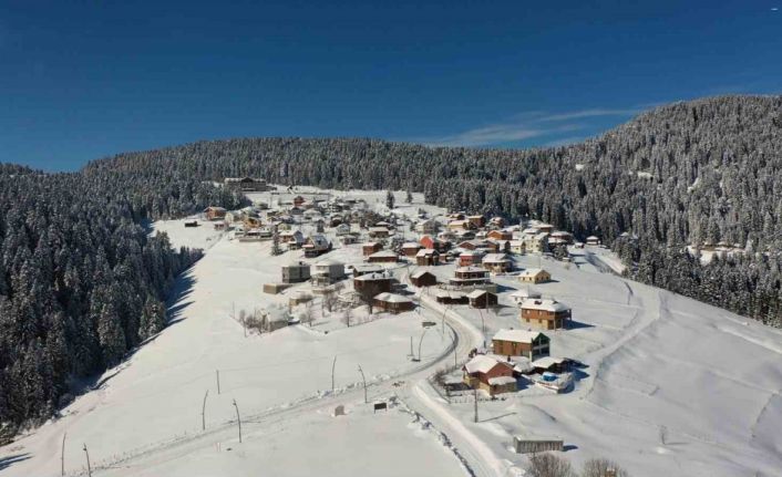 Giresun’un Yavuzkemal beldesine bağlı Kulakkaya Yaylası kar yağışıyla birlikte beyaz gelinliğini giyerken, beyaz örtüyle kaplanan yayla evleri drone ile havadan görüntülendi.