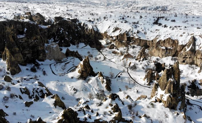 Nevşehir’de Cuma akşam başlayan kar yağışı, iki gün boyunca etkili oldu. Kar yağışı ile birlikte Nevşehir’in merkez ilçeye bağlı Uçhisar ve Göreme beldelerinde bulunan peribacaları beyaza büründü. Adeta bir gelinlik misali bembeyaz görüntüsü ile Kapadokya bölgesini etkisi altına alan kar yağışının ardından peribacaları kartpostallık manzaralar oluşturdu. Kapadokya bölgesinde kartpostallık manzaralar havadan görüntülendi.