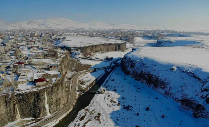 Ağrı’nın Diyadin ilçesinde bulunan ve kilometrelerce uzunluğa sahip olan Murat Kanyonu’nun beyaza bürünen kayalıkları görsel şölen sunuyor.