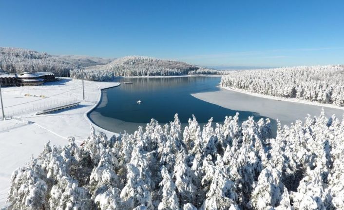 Düzce’de geçtiğimiz hafta sonu etkili olan kar yağışı yerini soğuk havaya bıraktı. Kaynaşlı ilçesi yaylalarına yağan kar, doğal güzelliklerin ortaya çıkmasına neden oldu. Fenerbahçe Spor Kulübünün tesislerinin de bulunduğu Bıçkıyanı köyü sınırları içerisinde yer alan, güzel doğası ve temiz havasıyla tatilcilerin uğrak yerlerinden biri olan Topuk Yaylası Göleti ise eksi 14 derecelere kadar gerileyen hava sıcaklıkları sonrasında buz tuttu. Deniz seviyesinden yaklaşık bin 300 metre yükseklikte bulunan, çam ağaçlarıyla çevrili göletin etrafındaki ormanlık örtü, yağan kar nedeniyle beyaza bürünürken beyazlıklar içerisinde kalan göletin havadan görüntüsü görenleri hayran bıraktı.