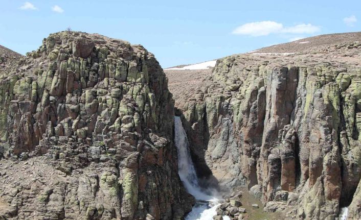 Bingöl’de yaz aylarında kuruyan, kış aylarında soğuklar nedeniyle donan 50 metrelik Çır Şelalesi, bahar aylarında karların erimesiyle coştu.