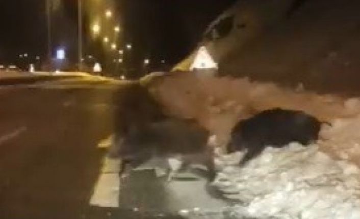 Bingöl’de zorlu kış şartları nedeniyle yiyecek bulamayan 15 yaban domuzu, yerleşim alanlarına kadar indi. Bingöl-Genç karayolunda gece saatlerinde seyir eden bir sürücü, şehir merkezine çok yakın bir noktada domuz sürüsü ile karşılaştı. Domuz sürüsüne yol veren sürücü, o anları cep telefonu kamerası ile görüntüledi.