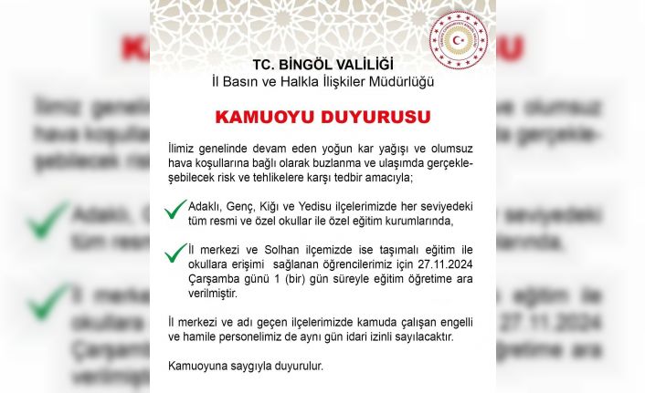 Bingöl Valiliğinden yapılan açıklamada, “İlimiz genelinde devam eden yoğun kar yağışı ve olumsuz hava koşullarına bağlı olarak buzlanma ve ulaşımda gerçekleşebilecek risk ve tehlikelere karşı tedbir amacıyla, Adaklı, Genç, Kiğı ve Yedisu ilçelerimizde her seviyedeki tüm resmi ve özel okullar ile özel eğitim kurumlarında, il merkezi ve Solhan ilçemizde ise taşımalı eğitim ile okullara erişi sağlanan öğrencilerimiz için 27 Kasım Çarşamba günü 1 gün süreyle eğitim öğretime ara verilmiştir. İl merkezi ve adi geçen ilçelerimizde kamuda çalışan engelli ve hamile personelimiz de ayni gün idari izinli sayılacaktır” denildi.