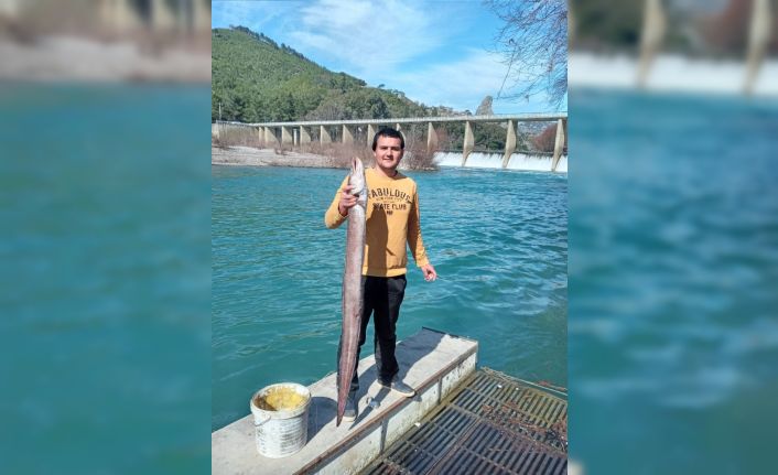 Antalya’nın Serik ilçesinde bir balıkçı ırmakta kendi boyu uzunluğunda yılan balığı tuttu.