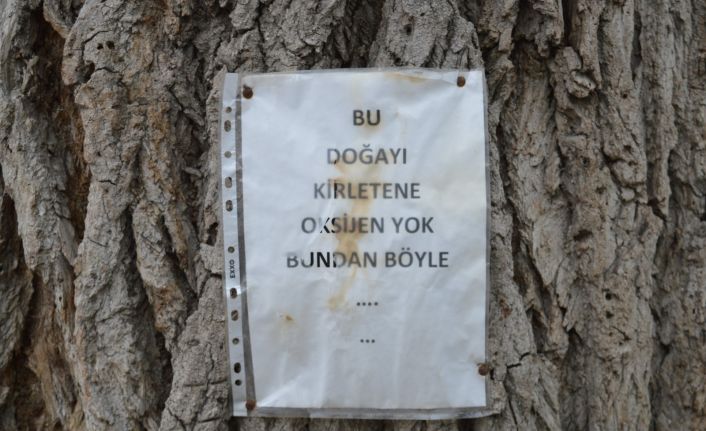Kentin Hamam Yolu Caddesi üzerindeki park alanında bulunan büyük ağaçlarının birine bir mesaj asıldı. Kim veya kimler tarafından asıldığı belli olmayan mesaj, sanki ağacın arzusu gibi insanları düşündürüyor. Doğa kirliliğine dikkat çeken mesajında, “Bu doğayı kirletene oksijen yok. Bundan böyle” yazılırken, insanların doğayı kirletmemesi gerektiği çağrısında bulunuluyor.Bu ağaç doğayı kirletenlere oksijen vermiyor