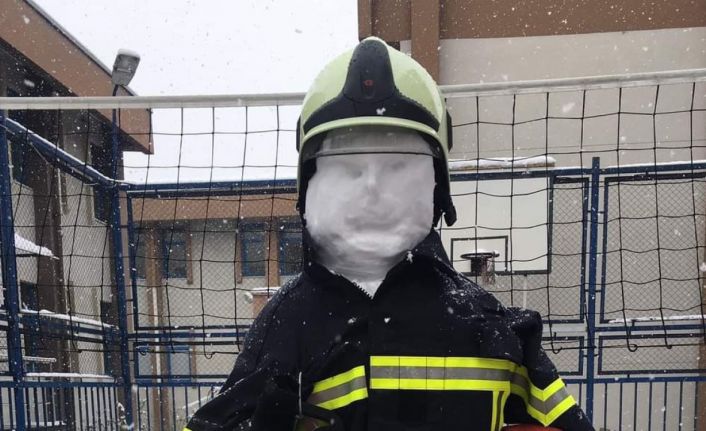 Kayseri’de itfaiye erleri tarafından yapılan kardan adama itfaiyeci kıyafeti giydirilerek ’kardan itfaiyeci’ ismi verildi.