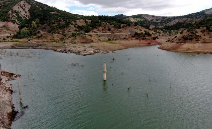 Sivas’ın Hafik ilçesinde bulunan Pusat Barajı’nda eski köy yerleşiminden kalan caminin minaresi adeta kuraklık ölçer oldu. Barajda suların çekilmesiyle minare gün yüzüne çıktı.