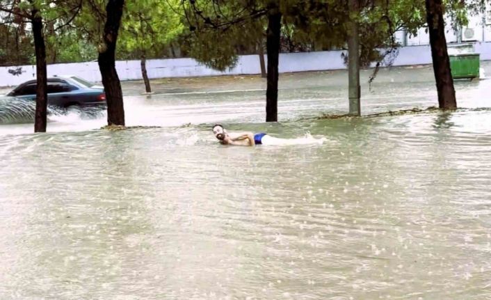Denizli’de 10 dakika devam eden sağanak yağış, cadde ve sokaklarda su baskınlarına neden oldu. Göle dönen bulvarda yüzerek sıra dışı bir tepkiye imza atan antrenör, "Deli değilim, Denizli’nin çöken alt yapısına dikkat çekmek için yaptım" dedi.