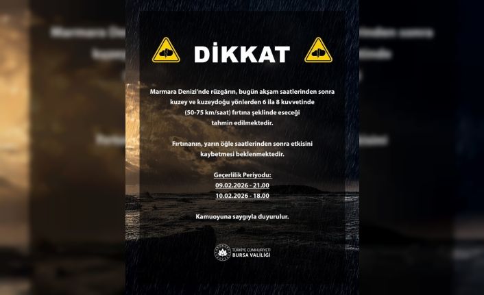 Bursa Valiliği tarafından yapılan açıklamada, 9 Şubat Pazartesi günü akşam saat 21.00’de başlaması beklenen fırtınanın yarın saat 18.00’e kadar etkisini sürdürmesinin beklendiği vurgulanarak, vatandaşlardan muhtemel olumsuzluklara karşı dikkatli ve tedbirli olmaları istendi. Valilik, rüzgârın kuzey ve kuzeydoğu yönlerden 6 ila 8 kuvvetinde eseceğinin tahmin edildiğini bildirdi.