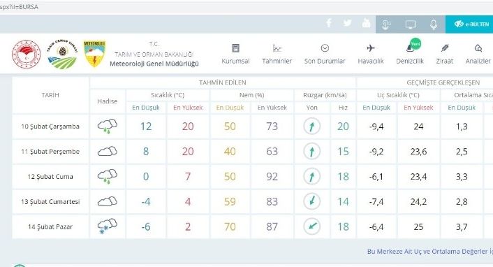 Meteoroloji Genel Müdürlüğünden alınan verilere göre, bugün Bursa parçalı bulutlu, sıcaklığın ise en yüksek 20, en düşük 12 derece olması bekleniyor. Sıcaklıkların cuma gününden itibaren azalması beklenen Bursa’yı, pazar gününden itibaren kar yağışının etkisi altına alacağını bildirilirken, pazar günü en yüksek sıcaklık 2, en düşük ise sıfırın altında 6 derece olacağı tahmin ediliyor.