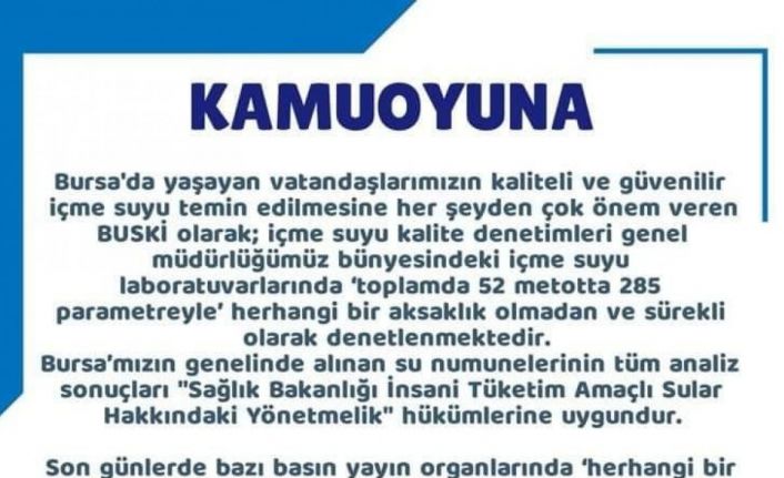 Bursa’da yaşayan vatandaşlarımızın kaliteli ve güvenilir içme suyu temin etmesine her şeyden çok önem veren BUSKİ olarak; içme suyu kalite denetimleri genel müdürlüğümüz bünyesindeki içmesuyu laboratuarlarında "toplamda 52 metotta 285 parametreyle" herhangi bir aksaklık olmadan ve sürekli olarak denetlenmektedir. Bursa’mızın genelinde alınan su numunelerinin tüm analiz sonuçları "Sağlık Bakanlığı İnsani Tüketim Amaçlı Sular Hakkındaki Yönetmelik" hükümlerine uygundur. Son günlerde bazı basın yayın organlarında"herhangi bir belge ve bilgiye dayandırılmadan" yayınlanan gerçek dışı haberlere itibar edilmemesini tüm Bursalılar’dan önemle rica ediyoruz. BUSKİ olarak laboratuvarlarımızda gerçekleştirilen denetimlerin yanısıra İl Halk Sağlığı Müdürlüğü tarafından içme suyunda ek olarak denetimler yapılarak içme suyunun uygunluğu teyit edilmektedir. Ayrıca aynı numuneler bağımsız başka laboratuvarlarda da paylaşılarak tüm sonuçlar sürekli olarak teyit edilmektedir. Bursa’mızda içme suyunun tüketilmesinde sağlık açısından olumsuz herhangi bir durum bulunmamaktadır. Çeşmeden akan sularımızı her zaman olduğu gibi gönül rahatlığıyla kullanabilirsiniz."