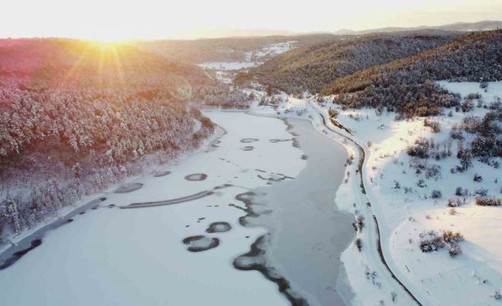 Buz tutan göletler ve çevresindeki karla kaplı alanlar, havadan kaydedilen görüntülerde kartpostallık manzaralar sunarken, bölgedeki kış güzelliği dikkat çekti.
