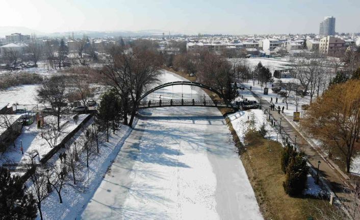 Eskişehir’in simgelerinden olan ve yaklaşık 8 kilometrelik kısmı kent merkezinden geçen Porsuk Çayı, geçen haftalarda etkisini gösteren şiddetli soğuk hava ve kar yağışı nedeniyle buz tuttu. Hava sıcaklıklarının sıfırın altında 15 dereceye kadar düştüğü kentte, Porsuk Çayı’ndaki buz tabakası yaklaşık 2 haftadır erimedi. Şehrin en çok ziyaret edilen yerlerinden Kanlıkavak Parkı’nı da ikiye ortadan ikiye bölen Porsuk Çayı’nın buz tutmuş hâli drone ile havadan görüntülendi. Köprüleri ve iskeleleriyle bilinen park, yüzeyi tamamen donan Porsuk Çayı ile birlikte kartpostallık görüntüler oluşturdu. Parkı ziyaret edenler ise manzara eşliğinde fotoğraf çekindi.