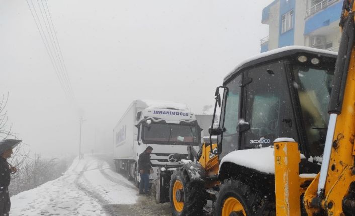 Şırnak’ın Uludere ilçesine bağlı Hilal beldesinde yoğun kar yağışı nedeniyle yokuşu çıkamayan yük tırlarının yardımına belediye ekipleri yetişti.