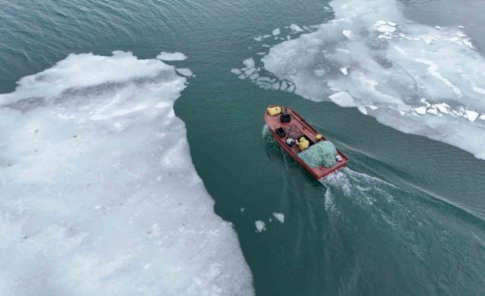 Bitlis’in Ahlat ilçesinde kış mevsiminde dondurucu soğuk nedeniyle yüzeyi buz tutan Nazik Gölü’nün çözülmeye başlamasıyla balıkçı tekneleri avlanmak için göle açılmaya başladı.