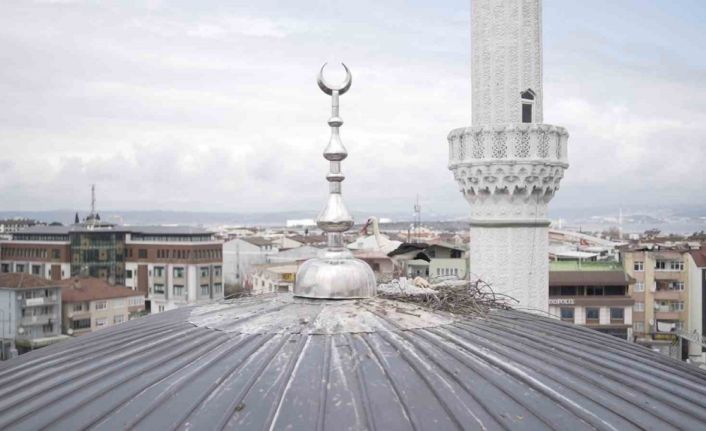 Cami kubbesinde kuluçkaya yatan leyleğe özel yuva