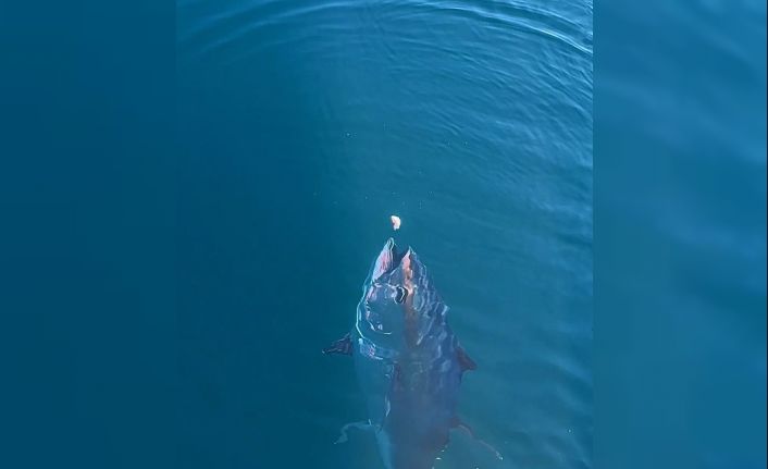 Çanakkale Gökçeada açıklarında ava çıkan balıkçıların dev orkinos balığını beslediği anlar sosyal medyada ilgi gördü.