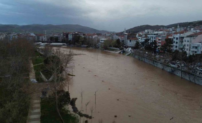 Biga’da etkili olan yağmur nedeniyle ilçe merkezinden geçen Kocabaş Çayı, debisi yükselince taştı. Çay yatağındaki otopark kullanıma kapatıldı. Otopark olarak kullanılan alanlar sular altında kaldı. Yağmur nedeniyle taşan Kocabaş Çayı dron ile görüntülendi.