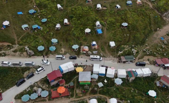 Trabzon’un Çaykara ilçesi’ne bağlı Demirkapı Yaylası’nda yöre sakinleri tarafından kurularak Arap turistlere kiralanan çadırlar görüntü kirliliği oluşturuyor. Zengin florasının yanı sıra bozulmamış doğasıyla adeta görsel şölen sunan yayladaki çadır kirliliği havadan görüntülenirken, turizmciler bu soruna çare bulunmasını istiyor.