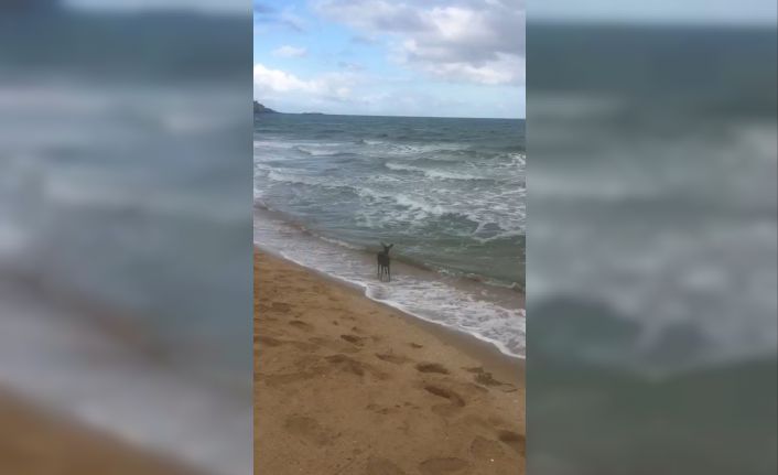 Denizin kıyısındaki karaca yavrusunu kayda alan Alper Akgül isimli vatandaş, bir süre karacaya seslenerek ‘Gel korkma’ demesine rağmen kameraya bir süre poz veren karaca yavrusu bir süre duraksayarak kameraya poz verdi.