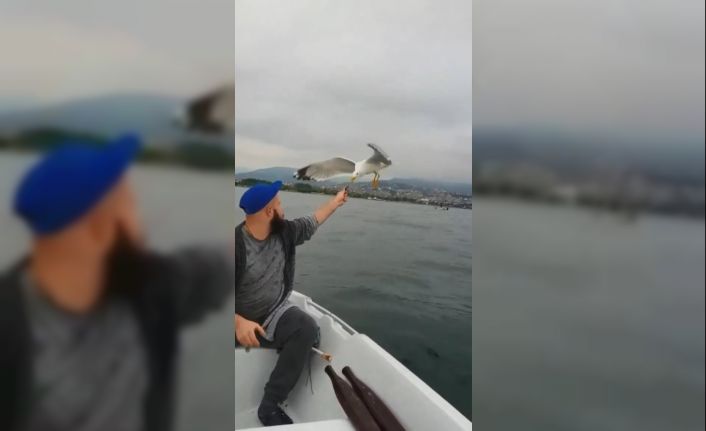 Kocaeli’nin Gölcük ilçesi Kavaklı mevkiinde balık tutmak için denize açılan iki arkadaş, yanlarına gelen martıyı elleriyle besledi. Balık alabilmek için tekneye yanaşan martıyı gören amatör balıkçılardan biri, tuttuğu balıklardan birini alarak martıyı beslemeye çalıştı. İlk etapta çekinerek balığı uzatan balıkçı, martının balığı aldığını görünce elleriyle beslemeye devam etti. Şahsın, martıyı besleme anlarını ise arkadaşı cep telefonu kamerası ile kayda aldı.