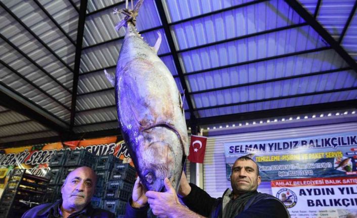 Bitlis’in Ahlat ilçesinde balıkçı tezgahında bulunan yaklaşık 50 kilo ağırlığındaki 1,5 metre uzunluğundaki orkinos vatandaşın ilgi odağı oldu.