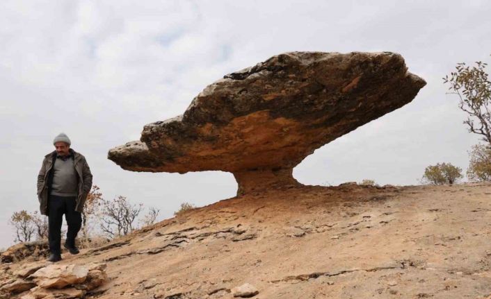 Diyarbakır’ın Kocaköy ilçesinde ince bir sütunla ayakta duran geniş kaya parçası, buzul çağı kalıntısı olarak değerlendiriliyor.