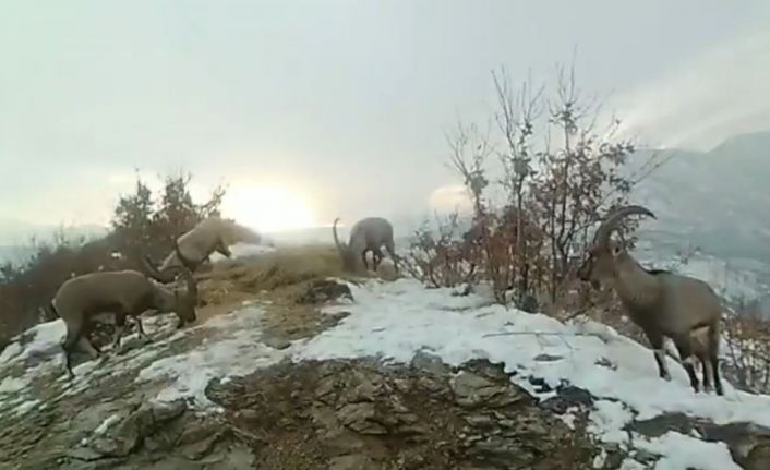 Elazığ’da doğaya bırakılan yemleri yiyen yaban keçileri ve kuşlar foto kapan ile görüntülendi.