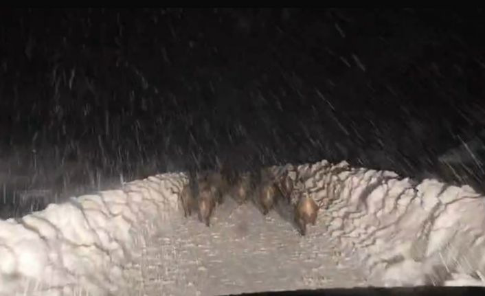 İl Özel İdaresi ekiplerinin Çeltikyolu köyünde karla mücadele çalışmaları sırasında yolda ilerleyen yaban domuzu sürüsü görüldü. O anlar cep telefonu kamerasıyla kaydedildi. Görüntüde, sürücünün karlı yolda koşarak ilerleyen domuzlara "yol verin" diye seslenmesi de yer aldı.