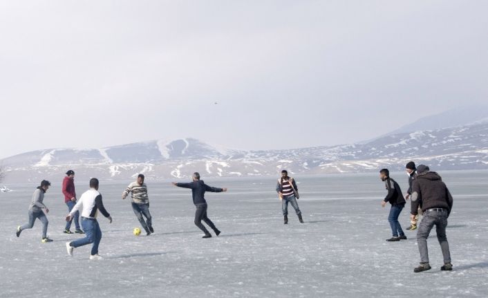 Ahlat ilçesinde bağlı Dilburnu köyündeki çocuklar ve gençler, yaklaşık 20 santimetre kalınlığında buz tutan Nazik Gölü üzerinde gün boyu futbol maçı yaparak doyasıya eğleniyor. Donan göl üzerinde futbol oynayan gençlerden Mehmet Oğur, kış mevsimi boyunca donan gölde futbol oynayarak boş zamanlarını değerlendirdiklerini söyledi. Mehmet Oğur, “Bitlis’in Ahlat ilçesinin Dilburnu köyünde oturuyorum. Biz burada normalde balıkçılık yapıyoruz. Aralık ayından sonra yılbaşına doğru buralar buz tutuyor. Buz tabakası bu sene 20 santimetre oldu. Normalde 40-50 santimetre kalınlığında buz oluyor ama bu sene hava sıcak geçtiği için 20 santimetreye yakın tuttu. Köylü çocuklar ve gençler olarak donan göl üzerinde top oynuyoruz” dedi.