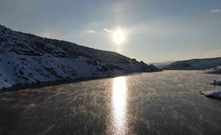 Sibirya soğuklarının yaşandığı Sivas’ta her gün ortaya çıkan farlı bir kış güzelliği doğaseverleri mest ediyor. Sivas’ın Hafik ilçesinde bulunan Pusat barajında dondurucu soğuğun etkisi ile su yüzeyinde oluşan buharlaşma gün batımı ile birleşince ortaya izlemeye doyulmayan görsel bir şölen çıktı. Baraj yüzeyindeki ışık kırılmaları ve buhar tarlası havadan da görüntülendi.