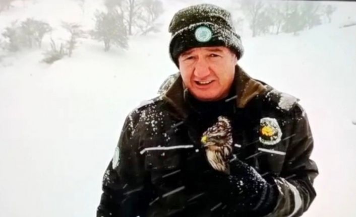 Osmaniye’de, Doğa Koruma ve Milli Parklar (DKMP) Görevlisi Ertuğrul Coşkun, donmak üzereyken bulduğu kızıl şahini ceketinin içine koyarak ısıtmaya çalıştı.