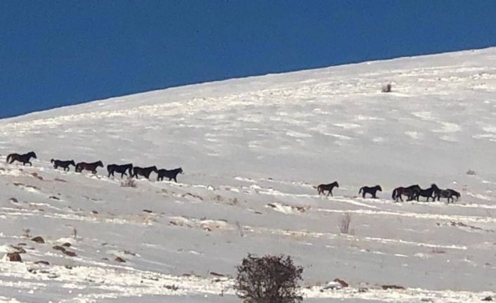 Sivas’ta DKMP ekiplerinin yem bıraktığı alana gelen yılkı atları drone kamerasına takılırken, atların bembeyaz alanda koşması renkli görüntülere sahne oldu.