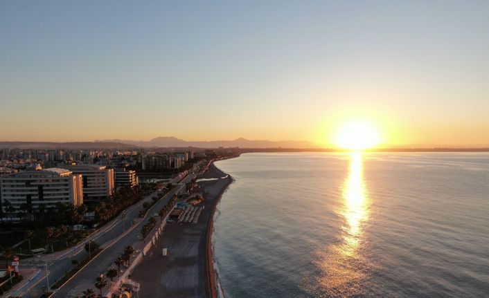 Antalya’nın dünyaca ünlü Konyaaltı Sahili, gün doğumunda oluşturduğu eşsiz renk şöleni ile birlikte havadan görüntülendi. Güneşin doğuşuyla birlikte oluşan kırmızı ve sarı tonlarının, gökyüzü mavisiyle karıştığı anlar kartpostallık görüntüler ortaya çıkardı. Kuş bakışı görüntülenen sahilde, gün doğumu ile birlikte denize girenler ve köpeklerini yürüyüşe çıkaranlar da kameraya yansıdı.Dünyaca ünlü sahilde kartpostallık gündoğumu