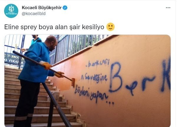 Kocaeli’nin Gebze ilçesinde bir at geçidin duvarlarına yazılan şiiri boya ile temizlendiği anları sosyal medyadan paylaşan Büyükşehir Belediyesi, “Eline sprey boya alan şair kesiliyor” notu ile vatandaşları esprili bir şekilde duyarlı olmaya davet etti.