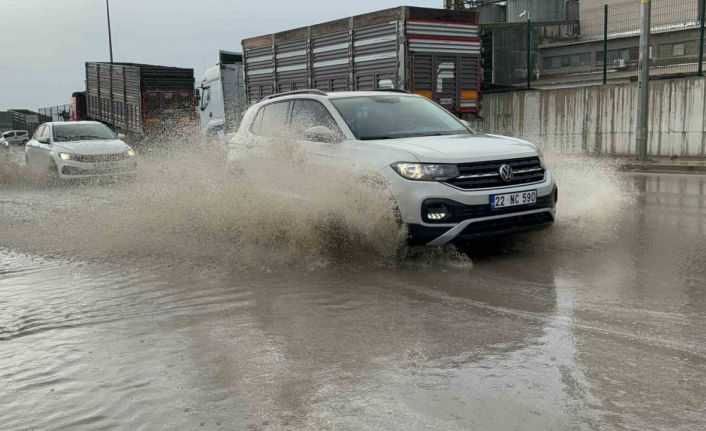Edirne’de etkili olan gök gürültülü sağanakta cadde ve sokaklar göle döndü.