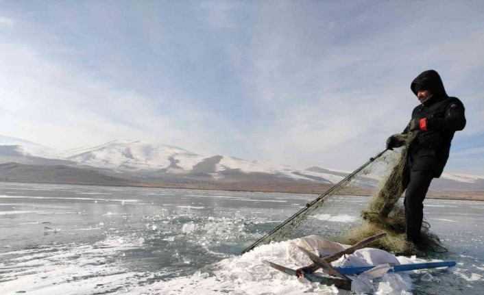 Hava sıcaklığının eksi 20 derecelere kadar düştüğü Çıldır Gölü’nün yüzeyinde, yaklaşık 20 santimetre kalınlığında buz kütlesi oluştu. 42 metre derinliğinde olan Çıldır Gölü’nde 15 metre aralıklarla buzları delen balıkçılar, deldikleri yerlerden ip yardımıyla çektikleri ağları atarak balık avlıyor. Geçimini balıkçılıkla sağlayan Yakup Topkaya, eksi 20 derece soğukta saatlerce uğraşarak göle serdiği ağların ardından bir hafta sonra aynı bölgeye gelerek attığı ağları çekiyor.