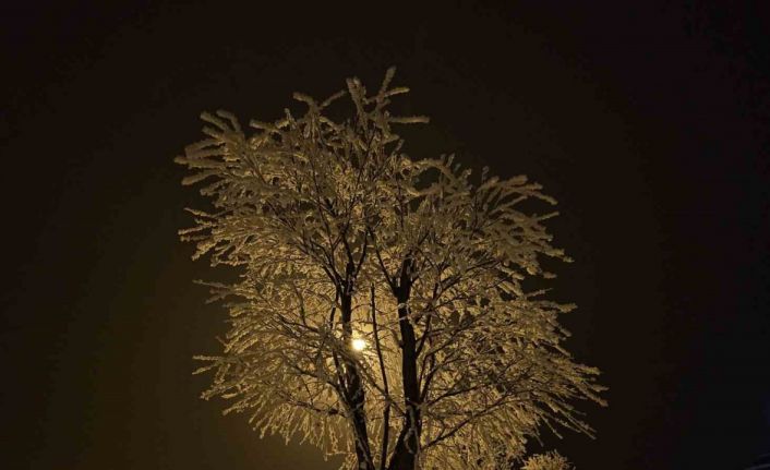 Elazığ’da etkili olan sis ve donla birlikte ağaçlar kırağı tuttu.
