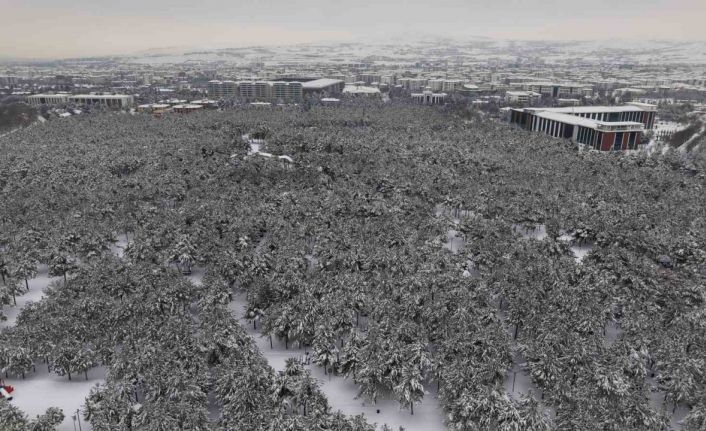 Elazığ’da kar yağışı sonrası şehrin kalbindeki Fırat Üniversitesi ormanı ve Kültür Park, binaların arasında yükselen beyaz bir vahaya dönüştü.