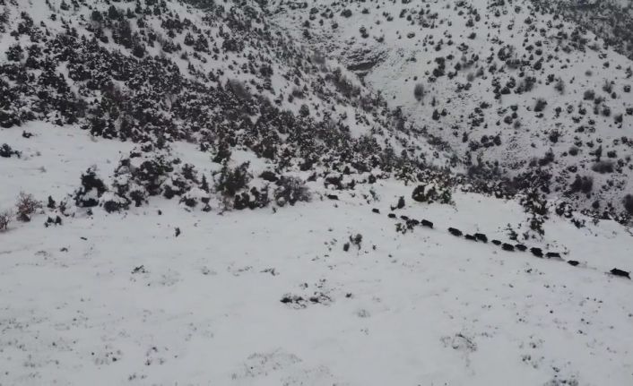 Elazığ’da kar üzerindeki domuz sürüsü dron ile görüntülendi