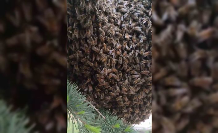 Elazığ’ın Baskil ilçesinde Celal Gürsul’a ait arılı kovanların bulunduğu bahçede oğul veren arılar, ağacı sardı. O anlar cep telefonu ile görüntülendi.